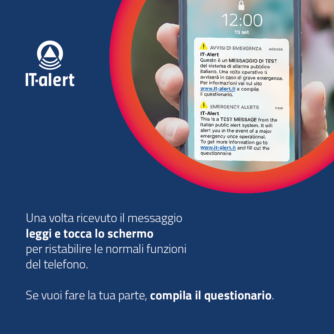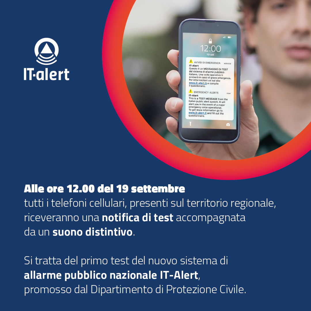 Martedì 19 settembre su tutto il territorio della Lombardia, si terrà l'evento di TEST del sistema di allarme pubblico IT-alert, il un nuovo sistema di allarme pubblico per l'informazione diretta alla popolazione, che dirama ai telefoni cellulari messaggi utili in caso di gravi emergenze o catastrofi imminenti o in corso.